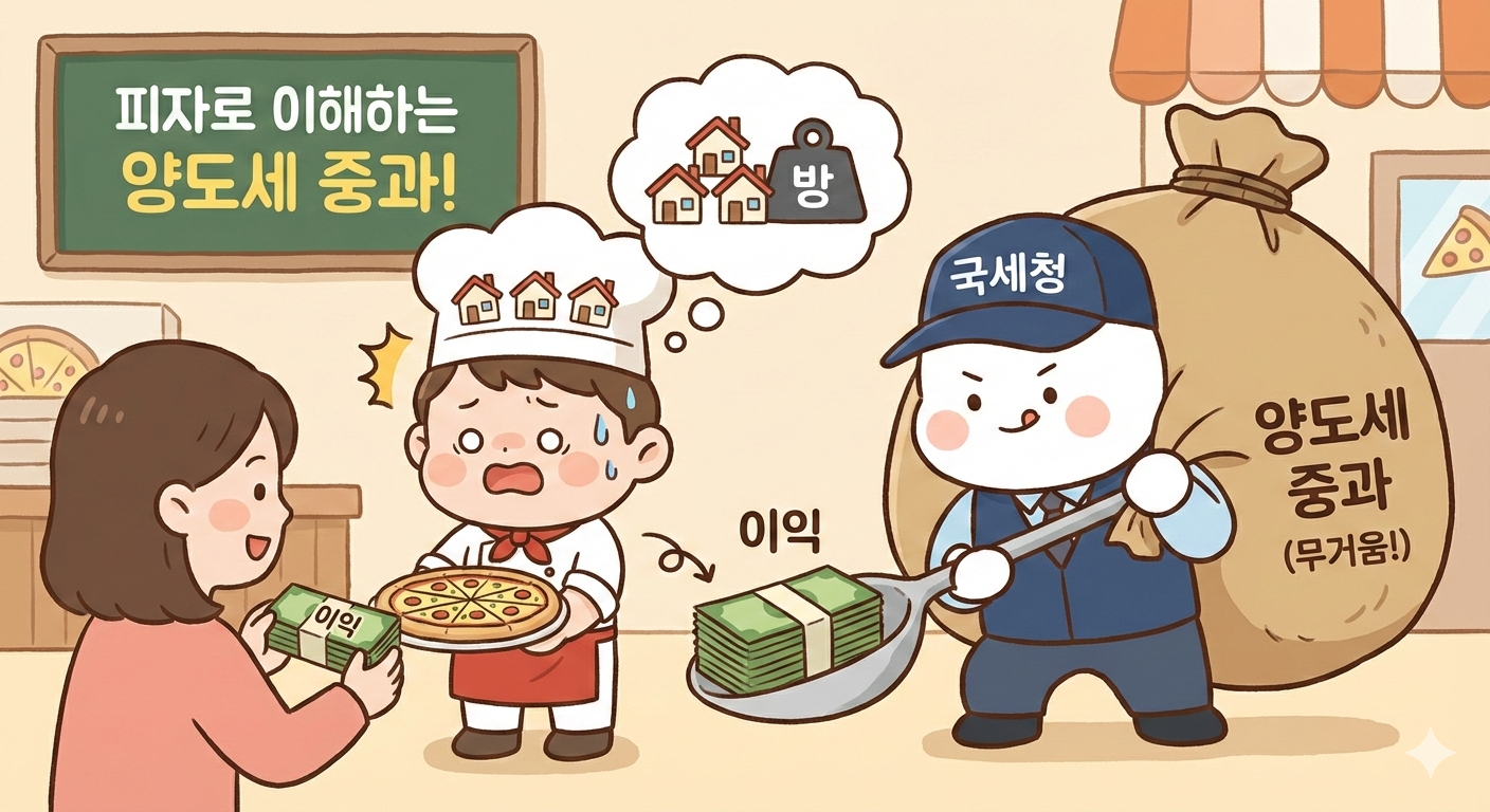 그래서 집을 여러 채 가진 사람이 집을 팔 때는 세금을 더 많이 내게 만들었어요. 이게 바로 "다주택자 양도세 중과"예요.