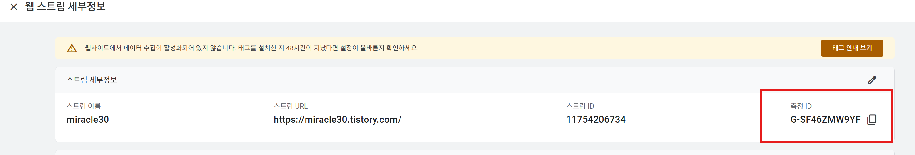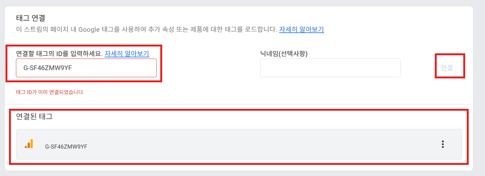 Copy 했던 태그 ID를 넣으면 아래와 같이 연결된 태그라고 나옴.
